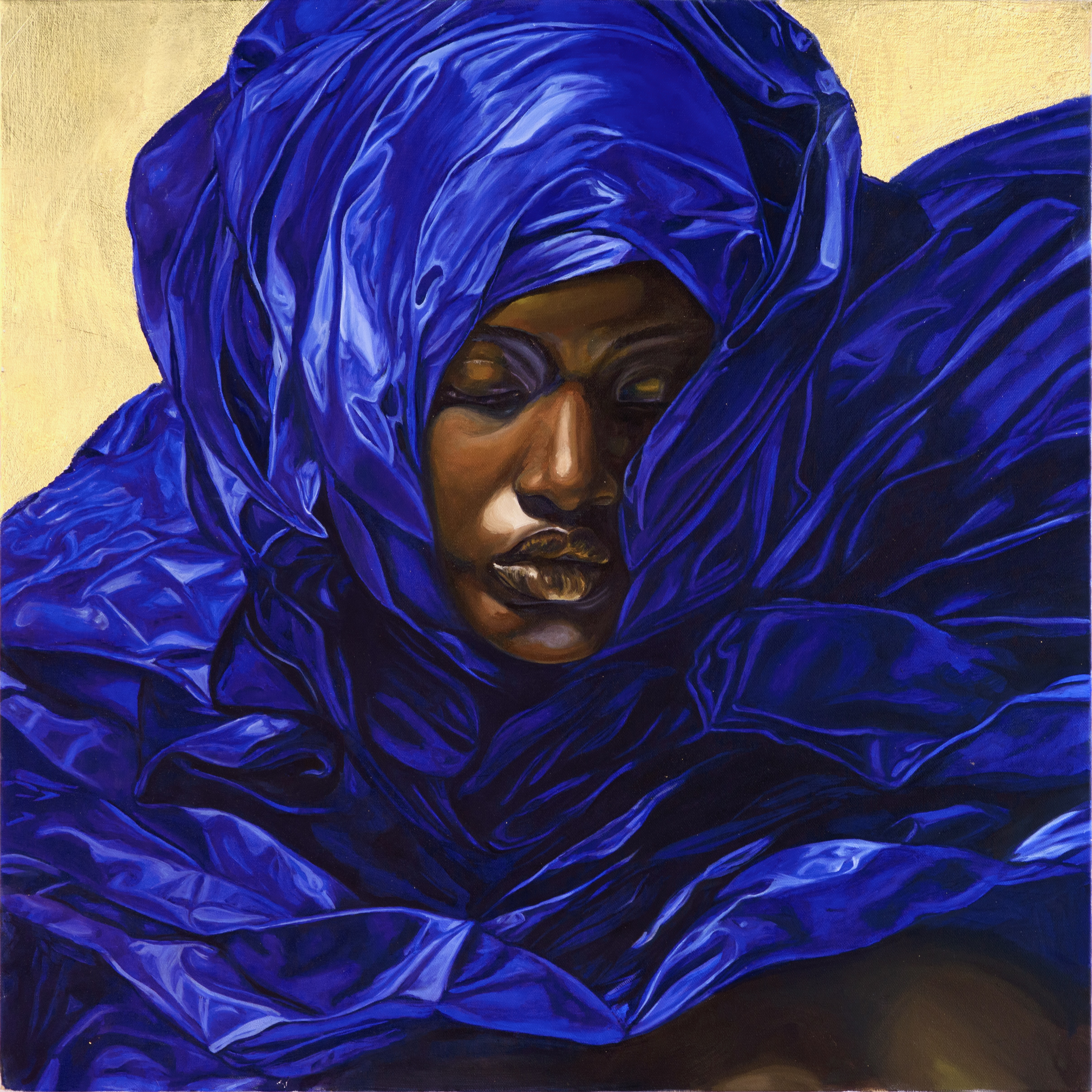 This painting was created during my residency at Bankside Hotel, where I’ve been exploring the theme “Form and Flow.” Inspired by Claire Jacksons Klein Blue collection, drawing upon the colour’s rich history; from precious lapis lazuli more valuable than gold in Renaissance times to Yves Klein’s revolutionary International Klein Blue that liberated this ancient pigment into pure modernity. A figure enveloped in cascading blue fabric against a golden background. Where Claire uses geometric abstraction to express certainty in a time of uncertainty through this impactful colour, I explore the human form as a site of similar tensions, creating a moment of profound immersion where the ultramarine becomes both architecture and atmosphere. The blue carries its spiritual and psychological weight, creating a cocoon that could be protective or constraining, a threshold between visibility and concealment. The golden background serves as both architectural space and the warm light that has traditionally set blue’s cool depths into relief throughout art history, creating those tensions between ancient and modern, structured and fluid, that define this residency where river meets stone.