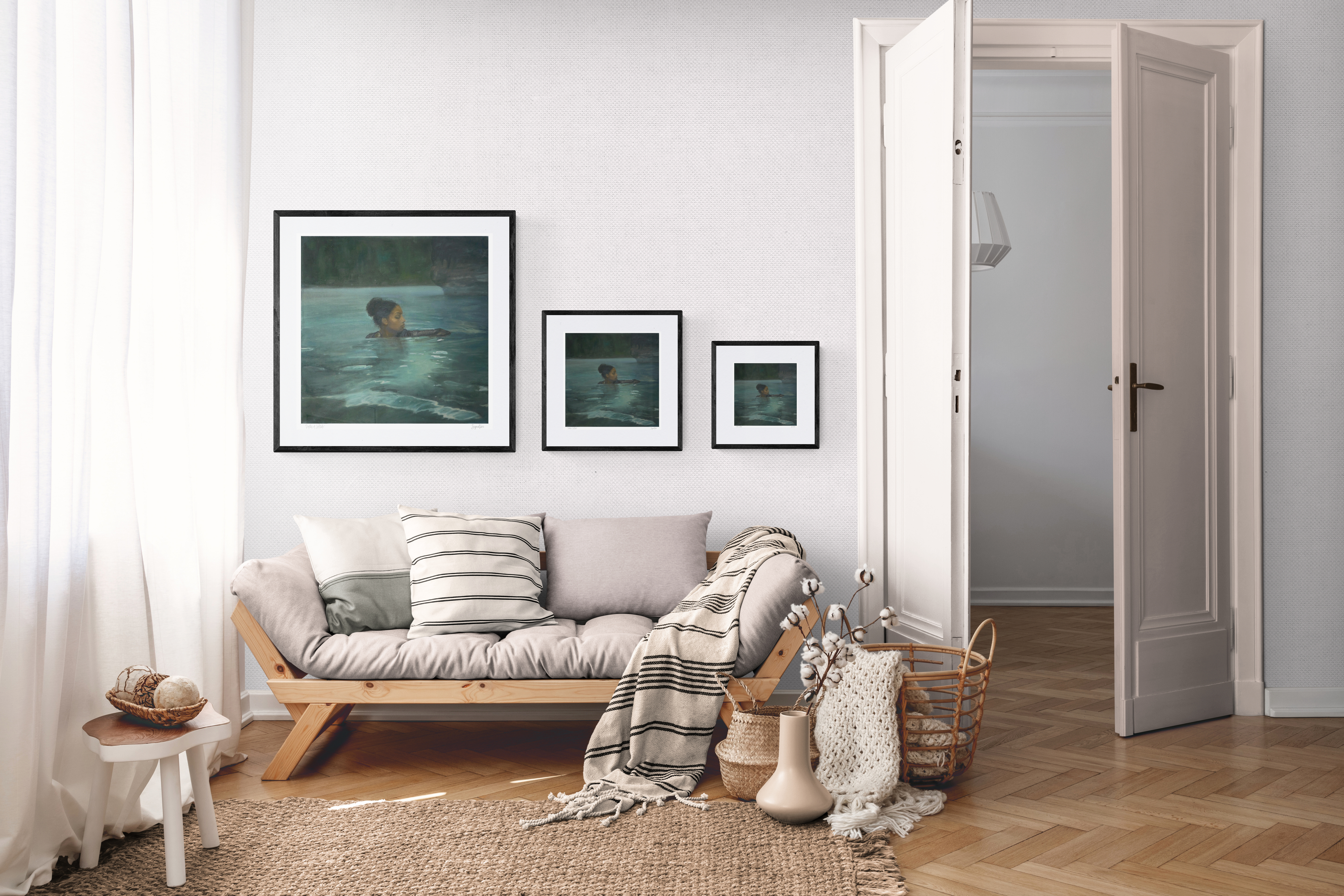 “Depths of Solitude” captures a figure partially submerged in luminous green waters, their profile turned in quiet reflection as the water envelops her. The painting draws inspiration from T. Alexander Harrison’s ” La Solitude” (c. 1893). Like “La Solitude” it explores the boundary between human figure and natural element, transforming a moment of physical immersion into a meditation on solitude and self-reflection. Drawing from Harrison’s atmospheric water studies, there is a restricted palette of deep greens and blues, creating an interplay of light and shadow across the water’s surface.
