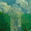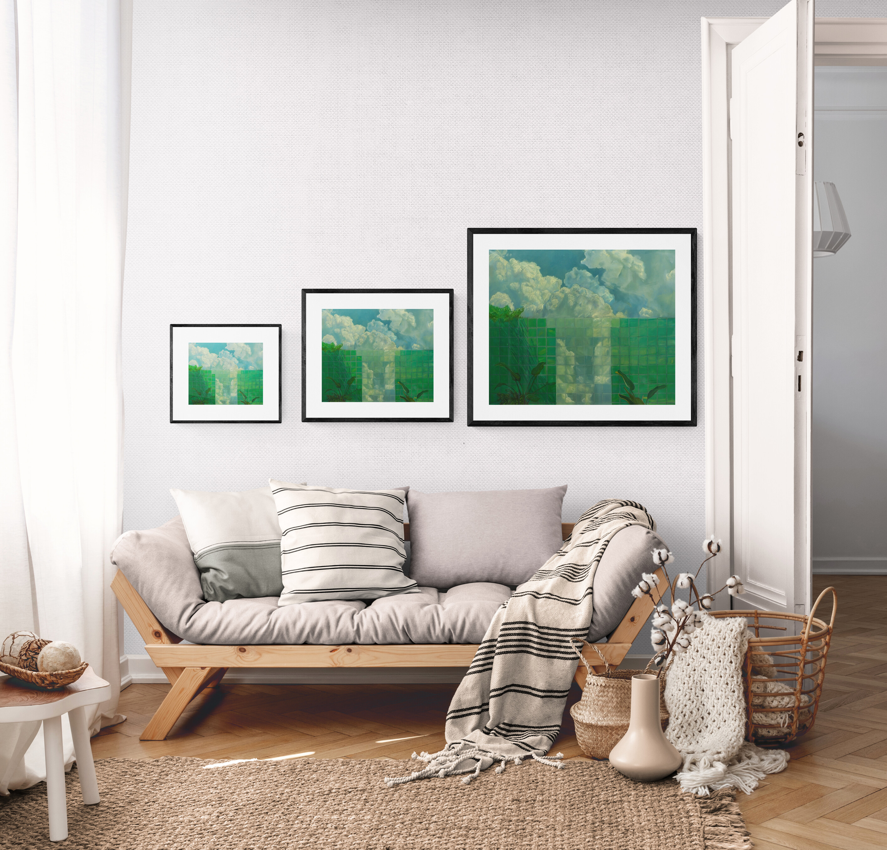 “Measured Eden” was painted as part of the “Summer of Sculpture” residency collection. The painting echo’s the glass facades that define the South Bank’s urban skyline. The composition juxtaposes organic abundance; dense foliage and dramatic cumulus clouds rendered in warm yellows and deep blues; against rigid cartographic geometry. This visual dialogue reflects the tension between natural forces and human systems of organization, influenced by the area’s layered architectural history from medieval foundations to the crystalline structures of modern towers like the Shard. The translucent grid captures the landscape, creating a meditation on how we frame, measure, and possess both urban and natural environments through systematic division. The painting explores the paradox of experiencing freedom within the systems designed to contain it, and how life frames even our dreams of escape through systematic division.