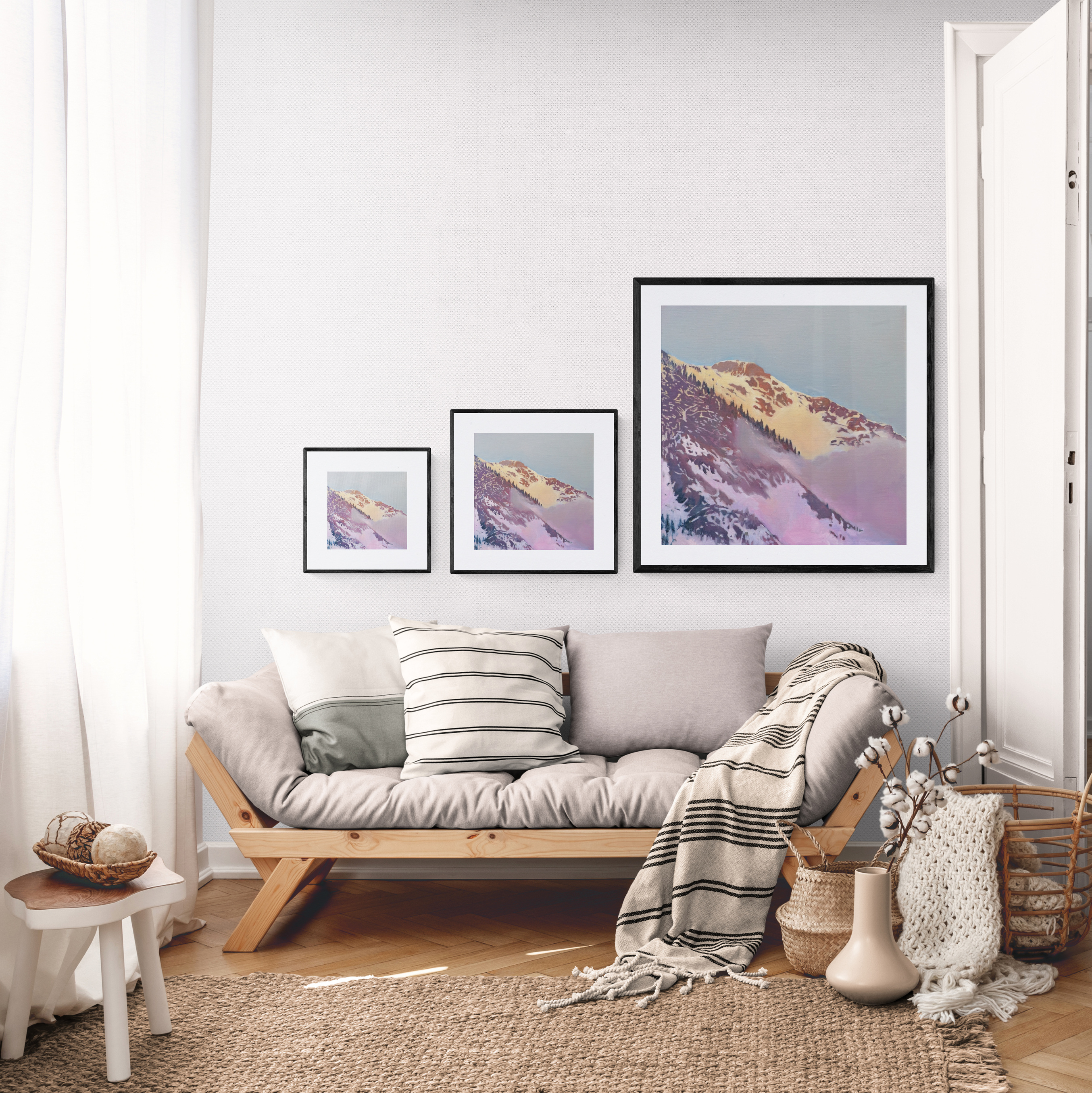Golden light hits the upper ridge while purple shadows fill the valleys below, half-hidden by drifting cloud. Dark conifers break through the snow, and where rock shows through there’s a shift from warm ochres to cool lavenders. A brief moment where the mountain edge dissolves into soft color.