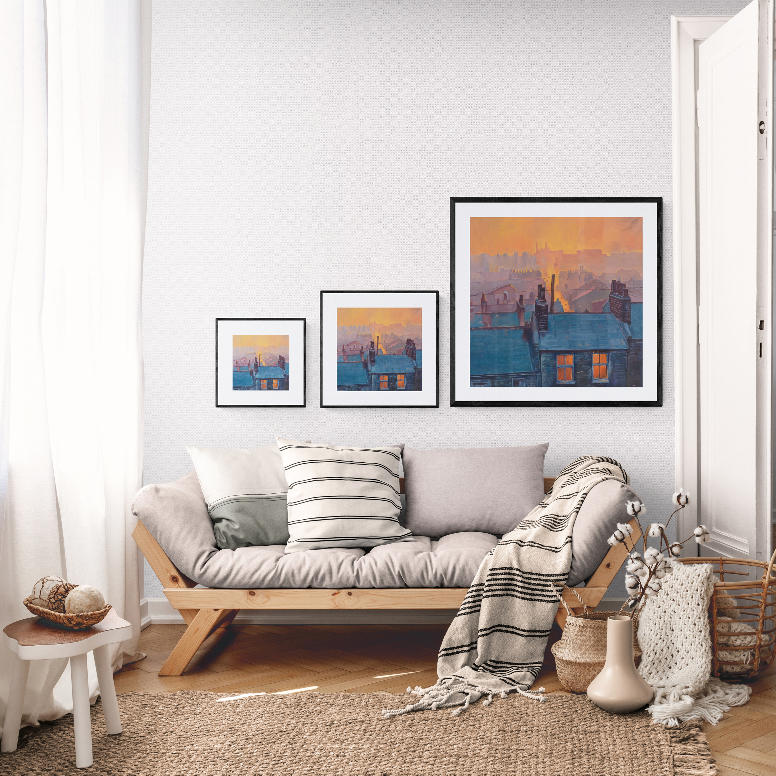 The last light turns the sky a deep peach while the buildings below go into shadow. Chimneys and aerials cut sharp lines through the haze. A few lit windows glow orange against the blue buildings. The warmth of the sky against the cool architecture, interior light visible from outside. This view comes from living in south west London, watching the city layer itself in the fading light.